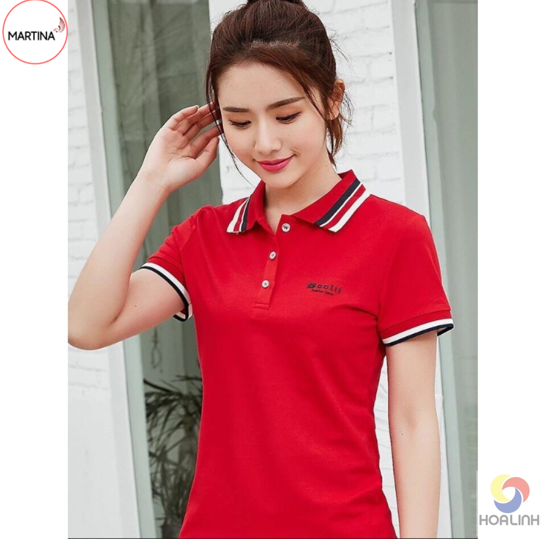 Áo Polo Nữ kiểu đỏ họa tiết sọc trắng đen